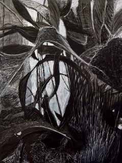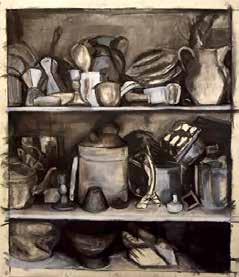 Alyssa Voytek’s graduate work captivates with a journey into chiaroscuro, using shadow and light in her series of black and white pieces. The works, Storage Orchestra No. 1, intrigues me because it is both intimate and mysterious. As if one is close to knowing a secret, yet it hasn’t been unveiled. Voytek paints the ordinary object while giving it luminosity. She groups pitchers, candlestick holders, cups cluttered on shelves, and has the instincts of a poet, who writes odes to the everyday object. She celebrates what is right in front of us. This is the artist’s job and intention, whether it is visual or written; to get us to notice what is often unnoticed, the way light bounces off a tea kettle, how shadow shapes the darkness, how the things in our daily life are imbued with beauty and meaning.