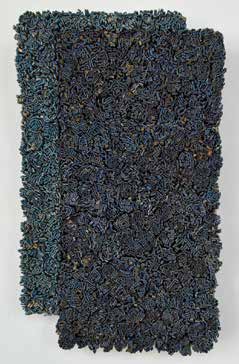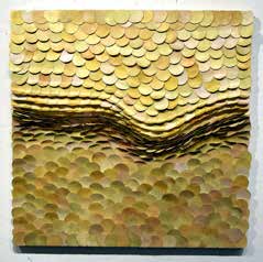 Jennifer Oliveira-Florio’s work, Gold, is done in encaustic, paper, acrylic and ink. This particular work is densely layered into coin shapes that look like fish scales. In the center of the piece is an undulating movement where the scales tighten creating a ripple effect of sensual energy breaking up the square shape. Florio’s preferred medium is encaustic which consists of using hot wax to strengthen the paper pieces and make it archival. One of the appealing things about encaustic is that it creates a milky veil over the surface thus adding another dimension. This Gold piece as well as her other works thus demonstrates a visual and tactile blend that becomes an elegant esthetic.