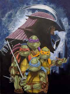 Jesse Navarra has his drawing hand on popular culture and is tuned into the zeitgeist. His piece, TMNT (Teenage Mutant Ninja Turtles), is rendered in graphite, acrylic and colored pencils. He portrays the group of turtles facing front of the picture and behind the turtles is the head of a striking and dangerous looking steel helmet of a possible enemy. Ninja turtles were named after Italian artists of the Renaissance, trained in the art of ninjutsu, unconventional warfare. They battle petty criminals, evil overlords, alien invaders while trying to remain hidden from society. Navarra’s piece places us in the center of the action with his composition. At first, one sees the turtles looking deceptively lovable as well as fearsome confronting the viewer.