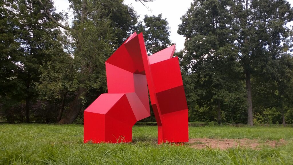 While the sculpture engages and encourages viewers’ interaction, it also integrates itself into the landscape—in a non-intrusive way—, as a flamboyant surreal man-made red bush or giant mushroom which has sprung up in the forest glade. It is also sensual in a sense, like two panels spooning, one embracing the other from the back, welded together in their concavity, becoming a whole in its asymmetrical beauty.