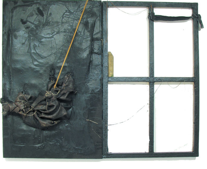 The muscular physicality in her mixed media imagery encompasses both her paintings and her assemblages. The sculptural quality of her surfaces somehow manages to both conceal and reveal simultaneously. Hart’s work seemingly erupts from beneath, rippling rents and wrinkles, bulging and burgeoning forms, some broken, some breaking out, from an undercurrent half hidden, but ominously present. Others weave the proverbial tangled web of crazily strung wire incarcerating non-figurative shapes. Fissures and tenuous, tentative threads, strings, slim cords are cast with abandon across a plane suggesting the inherent frailty of our mortal coil. Still others sport holes and geometries that incorporate their immediate environment, thereby becoming part of the work itself. Such are the windows into Hart’s world, and within it, she molds mysteries.
