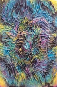 In talking about these works, I am reluctant to begin making connections to other Western artists of various periods, or adding to the discussion of East/West aesthetics. Comparisons of her work have been made in the past to the artists of the New York School (Pollock, de Kooning, et al), also to the Color Field painters (Olitski, Rothko), and even to the (widely differing) impasto techniques of Van Gogh and Albert Pinkham Ryder. All of these comparisons can be found and pointed out, it is true. But there is something about Tanabe’s lyrical paintings which makes me want to expand the creative comparisons far beyond that of the painted image, beyond the two dimensional form of a work held within the confines of a frame; beyond the confines of a gallery wall, beyond the confines of even an object. These works seem to be a small portion of something much more vast: the Oceans of the Earth. The work seems to easily bypass the idea of boundaries, to extend beyond the framed pictures placed on the gallery wall. They have an open and limitless quality; they seem to be a microscopic portion of something immense. Water, but great, unlimited expanses of water. The sea, perhaps, which surrounds the homeland of the artist, deep and pure, with only the very slightest hint of the potential for the danger of the sea, of the destructive tsunami that have struck the Japanese islands over the centuries. This is not, however, the sea in which Tanabe chooses to immerse us. We see the gentle subtleties of a clear sea and the light which penetrates it’s surface, changed and colored by it’s passage through these waters, and the movements of the light over the surfaces beneath the waters. The paintings make us think of the light blending on equal terms with the colored surfaces below the water. As it would be when one peers into the clear sea from above.