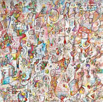 I started to think that there is a metaphor being presented here, for the complications of our modern life. These other patterns of Rubenstein seem to be in motion ceaselessly, like the activity on the city streets of New York, where he spent his earlier years, or the Los Angeles freeways where he ended up. Are they variations of this same energy? Are they creating tracers and tracks of modern motion in all directions at once, with endless sounds, activities, and visions: telephones ringing, Twitters tweeting, voice messages being left and then recited back, texts arriving to bleeping sounds and being returned dangerously and illegally while driving? Really, what’s too complicated now that multitasking is no longer a jargon word, but a way of life? I started to give my own names to the paintings that made me think this way: ‘Instagram Painting,’ ‘Twitter Painting,’ ‘Text-message Painting….’ But this was no good because these things are in all of them. They all have all of these elements and more.