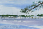 This painter, as a person involved with the affairs of humanity, is highly aware of our planet’s current state. Particularly concerned about the environment and our future, she asks what will be the ecosystem in ensuing years? Her painting, “The Year 2100,” does not answer this question optimistically as she paints a miasma of horizontal dark purples with flecks of vertical intimations of light attempting to make themselves known in the murk. The ghostly white daubs are almost desperate gestures, trying to exist in an environment drowning in danger, just as humanity struggles to triumph over the terrible effects of climate change.