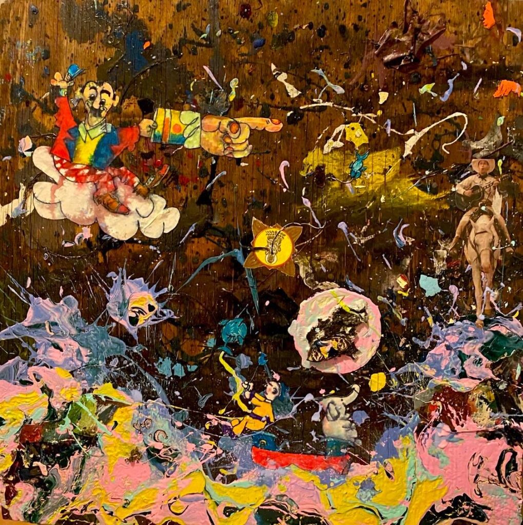 G&S Connections DavidJenowe April 19, 2020by Admin “Catching Covids”Enamel, collage, with fragments included from fellow GAP member Lynn Arnold, kid drawings, debris, and of course, some covid 19 24″ x 24”