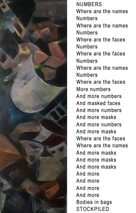 Strong rhythm moves the piece relentlessly to the final punch. It echoes the relentlessness of this pandemic. I am especially touched by your repetition of names and numbers that represent people and lives. It’s sad how we compile numbers without compassion for the families left behind broken and bereft. Through all your own trials, you remain strong and creative. Impressive!