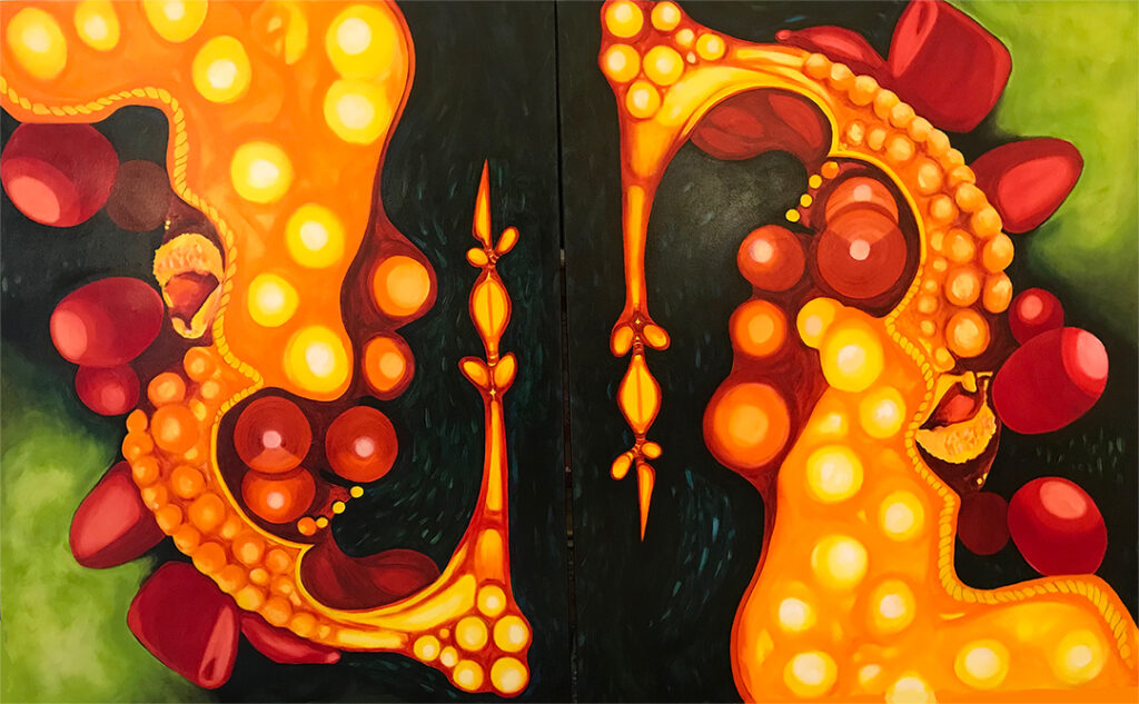 Abstract expressionist - 2 alien creature like objects  mirrored and flipped,  colored orange and red with bubbles on a green background