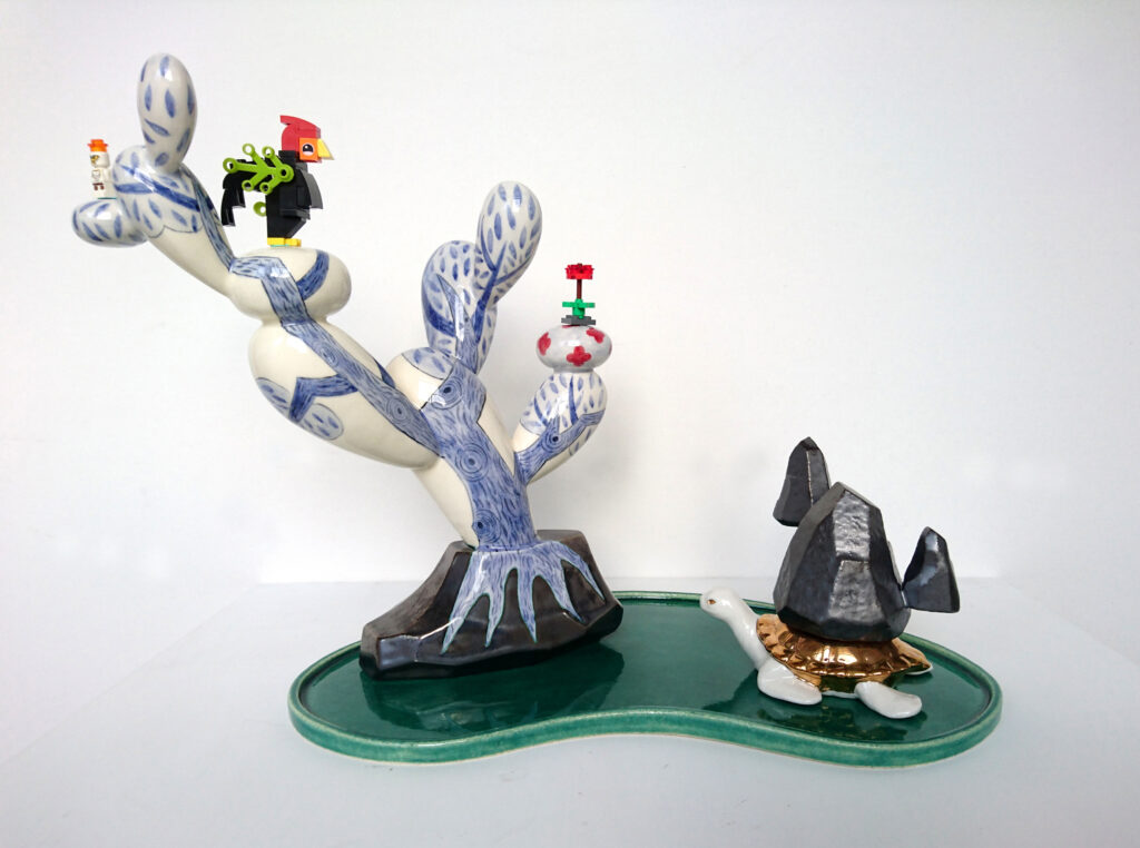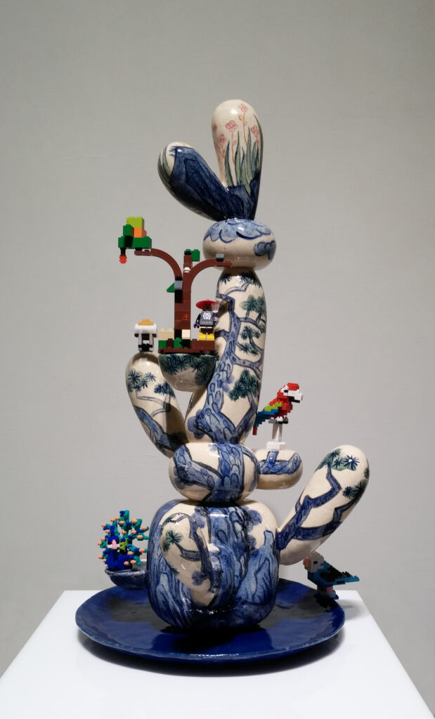 Today her sculpture is a mixture of the ancient art of ceramics which she considers “old” and “slow” material, incorporated with Lego-like plastic toys which she considers “new” and “fast” components. Cacti and turtles are motifs that are found often in old Chinese art and Yeh frequently incorporates with modern objects.
