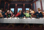 One of his more recent works is a 55″ x 96″ triptych titled So Many Roads, Grateful Dead 1965-Forever. As with most of his works, it is packed with a multitude of humanity, this time congregated before a mystical skyline which includes a bright sun in one section: a rainbow over the earth with lightning bolts in the middle. In the upper right of the third section, instead of bright sky, a moon shines above mysterious shadowy faces. The word “Forever” in the title adds a layer of mystery to Cenedella’s enigmatic Grateful Dead painting bringing an era of long ago back to life again . G&S