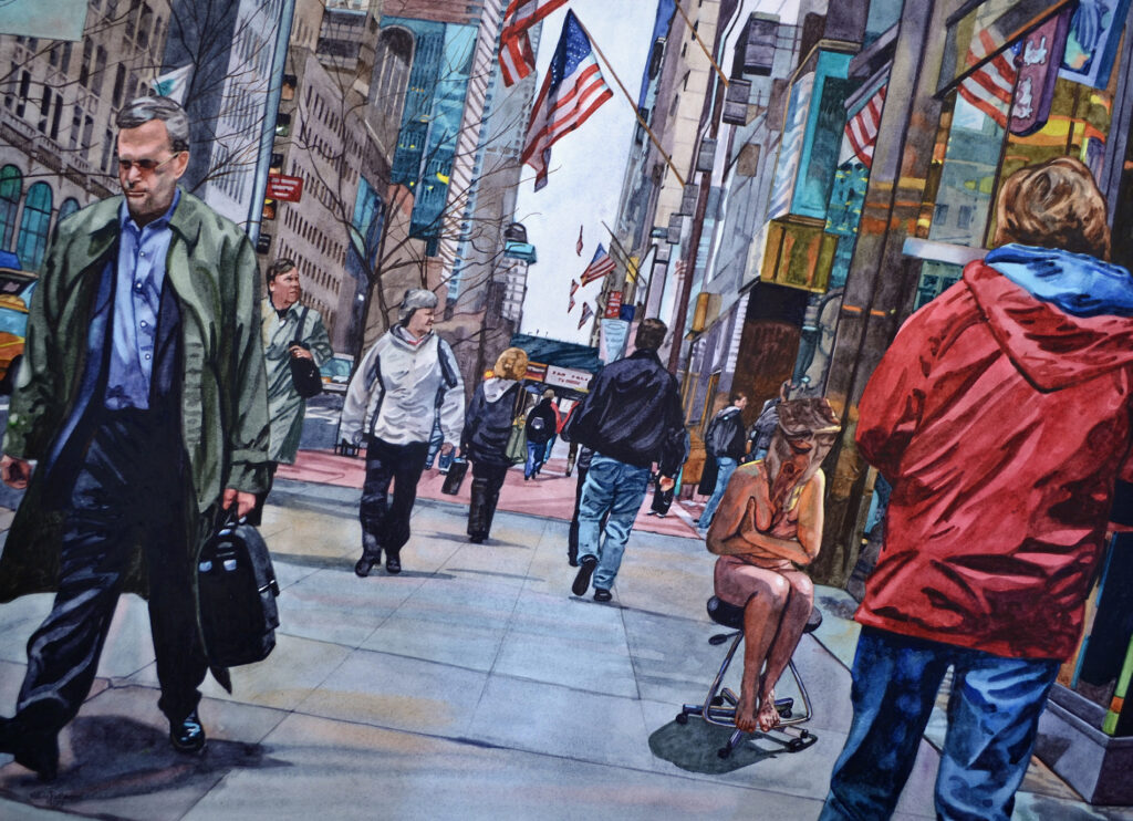 But, beneath the translucent surfaces, there is formidable angst; sometimes subjects are depicted with sardonic humor and at other times are ensconced in shadowy, isolated sadness. Her spectral nudes with paper bags over faces, one entitled Ghost in The Machine in a depressing city setting, conjures up not only feelings of urban anonymity, but also reminds me of a “capiroted” penitent in Torquemada’s Inquisition. Her renderings of solitary children are infused with trauma, devastatingly evident in paintings, such as Survivors, her interpretation of the wreckage of 9/11 aftermath or Response, a rosy little girl’s pleading for release from dismal city life along with another watercolor of a child intently writing “HELP!” in chalk on a sidewalk next to a ghostly American flag, perhaps signifying the artist’s worries for our future. These are just some of the many depictions of concern Patterson paints, graphic expressions almost crushing viewers from the weight of bruised human psyches.