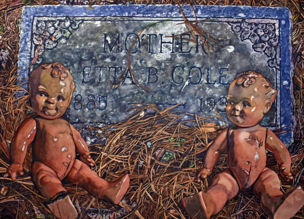 Like the author, Patterson repeatedly calls out evil and her artistic renderings elicit viewer discomfort. This can be seen in the painter’s recurrent employ of images of baby dolls, present in so many of the pieces such as in the disturbing watercolor, Our Grateful Dead, where disconcerting, sweet countenances on two dolls exude horror as they are propped up against a mother’s gravestone, dispelling our ennui about cognizance of the corruption of innocence, shaking our sensibilities to the inconvenient and tragic awareness of death’s finality.