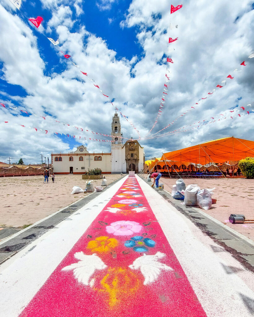 Daniela spotted her friend, Juan. He and his wife and children were kneeling on their hands and knees, carefully placing flower petals on colorful birds on the periphery of their carpet. Juan greeted us, and we spoke briefly. He explained that, in Mayan culture, birds are considered harbingers of good fortune. Then, he told us alfombras are a community project. “Everyone gathers at the crack of dawn on the Thursday before Good Friday to fill in their family’s wooden stencil.” I asked him how he felt about producing a work of art whose inevitable destiny was to be destroyed. He seemed surprised by my question. “It doesn’t get destroyed.” he objected. “It’s a spiritual experience. It stays inside us and keeps going.” He said his parents handed the tradition down from their parents, and he and his wife will hand it down to their children. “It stays inside and keeps going,” he repeated. Then, he excused himself, saying they had to finish by 4 AM when the religious procession would begin.