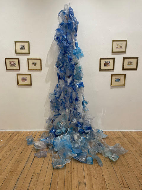 Upon viewing Nemec’s installation Plastic Waterfall, my thoughts turn to childhood visits to Niagara Falls where I would stand awestruck at the mighty waters majestically cascading before me, bathing my face in cool mist. Ancient indigenous people knew the profound value these falls had, respecting them as holy dwelling places of the Thunder Beings, powerful entities tasked with protecting land and home. The striking azure hues of Nemec’s sculpture belie a tragic message about the piece, that nature is in a sad state as finite resources are desecrated by careless human hands, a formerly pristine world increasingly degraded.