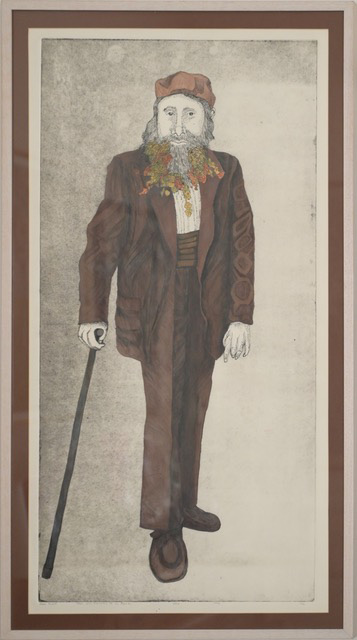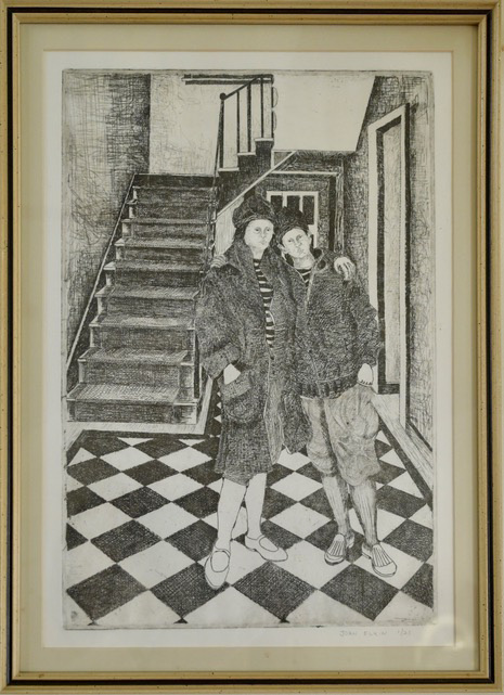 In Rose and Zelda, we see Stanley’s mother Zelda, or Tootsie, as she was called throughout her life, and her sister Rose in a Chicago hallway. Joan made this lithograph in a printmaking class at Washington University, and it was a frontispiece in River Styx magazine in 1984. The cloche hats, sporty period outfits, and setting suggest the roaring 20s. Tootsie gave Stanley and Joan what Stanley called his Tootsie grant so that he and Joan could go to Rome for a year and Stanley could write his first novel.