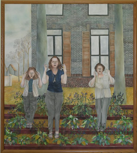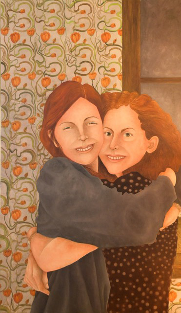 One of Jean Siméon Chardin’s secrets in the 18th Century may have been preparing his canvases with a dark gesso or background, while one of Joan Elkin’s secrets was sizing her canvases with light gesso on both the front and the back. Two more Chardin trademarks were painting everyday things and people rather than the Rococo high life and painting with meticulous care. Joan Elkin did this as well. She painted family and friends using her own version of pointillism and other labor-intensive styles that nod to Seurat’s Divisionism. She chose symbolic locations from her life, travels, art books, including the family’s Westgate house, a favorite library, hill, wall, or path. She also transformed favorite photographs into art. The resulting paintings, watercolors, and lithographs offer gestures and interactions that convey humor, irony, and empathy. Joan’s subjects gaze directly at viewers, as do those in Velasquez’s Las Meninas. Looking at someone directly can make a difference in life and in art.