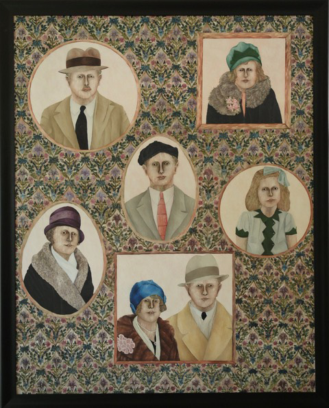 The lower portrait shows Ted and Dorothy as a smartly dressed couple. The elaborate overall wallpaper background and square and oval frames memorialize Joan’s family, especially her brother Bernie.