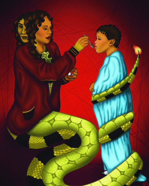 Jillian Kathryn Mirabal deploys digital artistry to create nightmarishly imaginative scenes of terror. Particularly haunting is the draconian embrace of A Loving Mother, a two-faced (literally) green mom-ster, complete with scaly green tail, threatens to fatally squeeze the child she spoon-feeds. “I’ve always been drawn to the darker and more unusual aspects of life,” explains the artist. “Growing up, I was immersed in horror and Halloween-themed media—through my mother’s love of horror movies and my father’s mission to create the scariest haunted house in the neighborhood,” Mirabal recalls. “These influences naturally find a way into my work. Through my art, I aim to shed light on the unspoken and unsettling—those captivating spectacles that people often try to ignore.” G&S