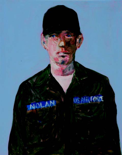 Joseph Nolan’s deeply felt portrait paintings let us pause to contemplate people we might not have expected to find on contemporary art-gallery walls: America’s war veterans. Airman Patrick Nolan depicts the artist’s twin; both twins, and their younger brother Jack served in the U.S. Armed Forces, (Joseph in the Marine Corps, Patrick in the Air Force, and Jack in the Navy; their father, also the subject of a painting, was a WWII vet who served in the Navy at Iwo Jima). “I am a Vietnam veteran and a Gold Star father,” the artist says. “Initially, my work centered around my son Joe, who was killed in Iraq in 2004. He was an Arabic linguist in the Army.”