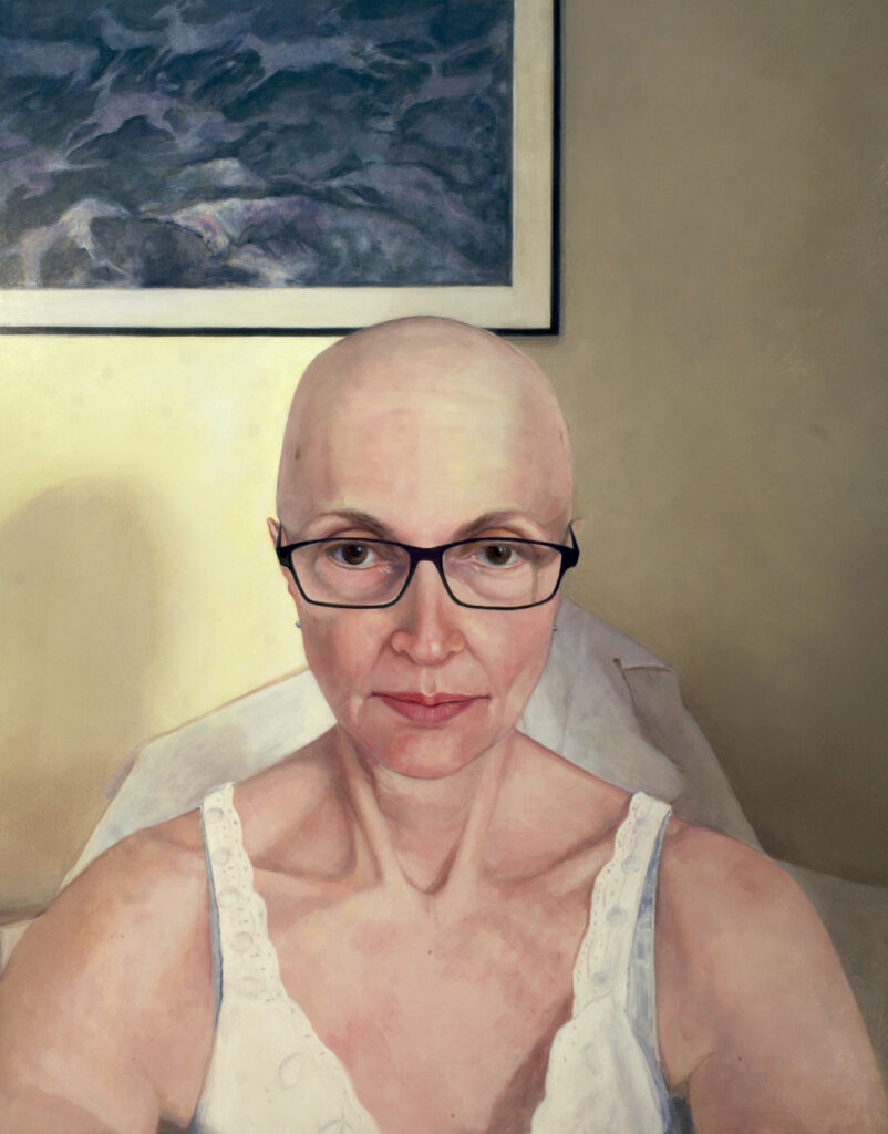 Porta’s documentation of chemo’s aftermath in her painting Ambiguous Selfie, Buddhist Nun, Chemo Patient? sears, evoking visceral reactions in me from its detailed rendering of a vibrant woman, with head now bald from invasive treatments, her countenance a citation of witness and resignation at the brutal onslaught. The painting is of true grit as the prohibition of creativity’s defeat. “Yes, it has changed my artwork as one’s mortality is front and center. Has it changed my outlook artistically? I don’t think so. This is my second diagnosis in 15 years, so I have an overview.”