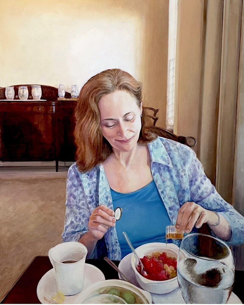 She paints an awareness of nourishment’s sacred role in cancer recovery in a self-portrait of sitting at a table where her flowing chestnut locks have replaced the baldness as she enjoys a savory meal, the painting becoming documentation of therapeutic action, a continuing process she compliments with Zen practices and Shūkōkai to meet the maladies’ challenges. “Zen practice has grounded me throughout my adult life. It’s not easy and there’s no rainbow but it’s priceless.”