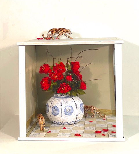 Her versatility and her interest in various media styles early on gave rise to a career as a scenic artist, working as a member of Local USA 829, a union representing designers and scenic artists. She created scenery for the Metropolitan Opera, Broadway and in feature films which can be seen in a YouTube interview on Art in Conversation with Farrin and on her website. She explains that “the large scale and diverse materials and processes I had access to were very exciting.” She realized that “there are no boundaries here, I can play with anything! It was fun!” This flowed into her personal art, with sculptures and installation art becoming a significant part of her portfolio.