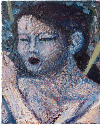 Like a cosmetic surgeon, Park studies their own nude image and boldly remodels it. The physique is never quite “perfect”: part Renoir, part Gauguin, and part Jenny Saville, with a strong dose of lush painterly abstraction. Deploying their paintbrush like a scalpel, spackling on paint as if it were theatrical makeup, Park locates and relocates physical features, figuring and reconfiguring muscle and tissue, flesh and bone, as if fantasizing about the surgical process of transition. We see and feel the longing to soften angular masculine features, to anchor curvaceous female breasts convincingly on a six-foot-three male frame, to accent girlish extremities: fingers, hands, toes, feet—in Martha Graham’s words, the “miracle of the small beautiful bones and their delicate strength.” In Park’s operating theater, perfection is an attainable goal: Chun’s Secret Angel pays tribute to the winged supermodels of the Victoria’s Secret fashion brand.