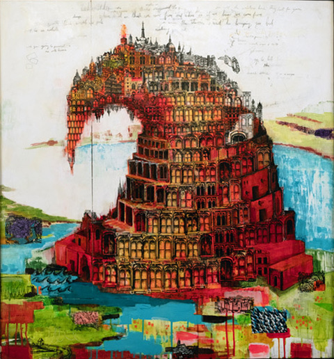 The tumult sent him into a depression, but Hochbaum fought back by deliberately injecting joy into his work. He focused on a brighter color palette and streamlined subjects. Boats and buildings harkened back to his time in New York and gave the work continuity, but collections like his Adrift series depicting empty rowboats on wood, paper, and canvas, and his stacked wood house sculptures, were minimalistic in comparison to ornate women and sea goddesses with shipwrecks in their hair. Even his sprawling paintings of towers, sprung from a lifelong fascination with the Tower of Babel, seemed spare in contrast. He recalls, “I kept what I liked and stopped doing what I no longer needed.”