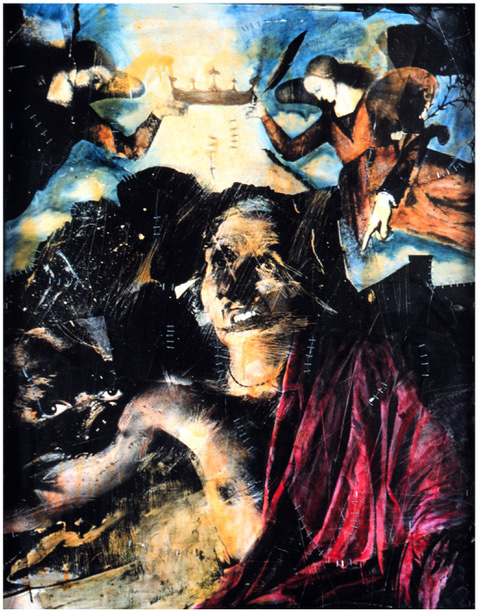 What resulted was a compelling signature style that to this day remains simultaneously whimsical and disciplined. Hochbaum’s early pieces from this era were collage-like paintings incorporating everything from acrylics to polaroids and carbon transfers, inspired by maritime lore, astrology, Marie Antoinette, and architecture. They often included black and white nudes juxtaposed with tall ships, sea monsters, floating ladders, and cityscapes. Many were adorned
