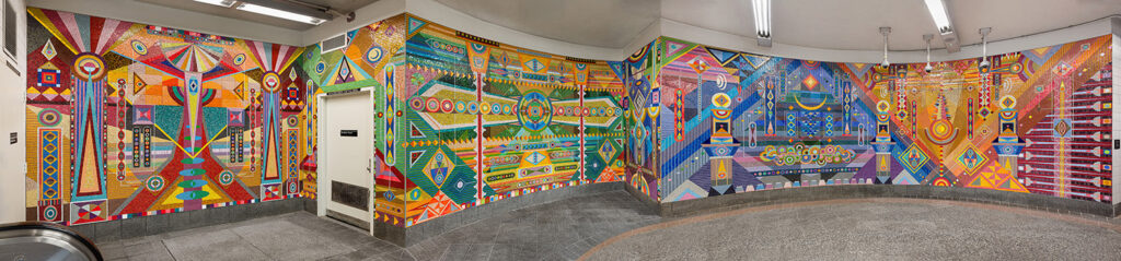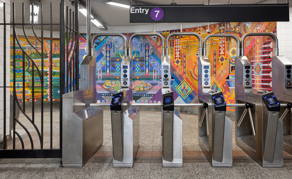 “We look for those moments and experiences that elevate or transform a rider’s daily experience through the [subway] system,” says Tina Vaz, Director of MTA Arts & Design. She emphasizes the sheer number of commuters that traverse the New York subway system each day, exceeding 4 million. “We look for work that responds really successfully to the site, but also work that rewards repeat viewing, which is definitely the case with Abstract Futures. It’s very visually rich. If you are passing through that space multiple times, as many of our riders are, there is still something for you to discover every time you pass it.”