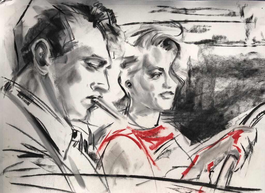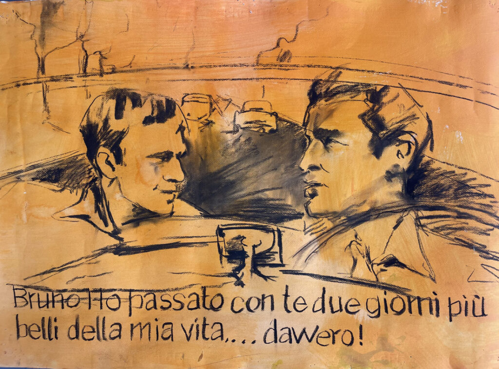 “I use charcoal and oil in typically large format and the work consists of gestural drawings and paintings that reflect the source material, numerous screenshots of my favorite postwar films,” says the artist. “After selecting the most evocative images, in my eyes, I incorporate text, not necessarily based on the original still.” With the Fotoromanzi series, she adds, it was important that the subtitle captions be in Italian, “a crucial element for maintaining authenticity.”