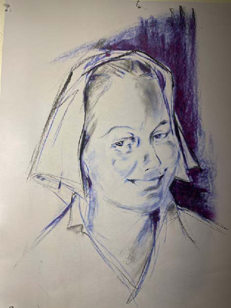 With timeless skill, Streeter’s portrait practice makes historical figures appear contemporary, while her modern-day subjects echo the Old Masters. Sketching the grinning image of legendary curator Alanna Heiss, for instance, art world movie star, founding director of P.S. 1 Contemporary Art Center (later known as MoMA P.S. 1) and Clocktower Productions, Streeter captures Heiss at a particularly mirthful moment, a white cloth napkin playfully plopped upon her head like a seventeenth-century bonnet. The untitled result—an unmistakable likeness that calls to mind the deft portraiture of Judith Leyster, a lesser-known, and arguably more gifted, contemporary of Frans Hals—could easily be an outtake from a convincing period film about, say, The Merry Lace Maker of Antwerp.