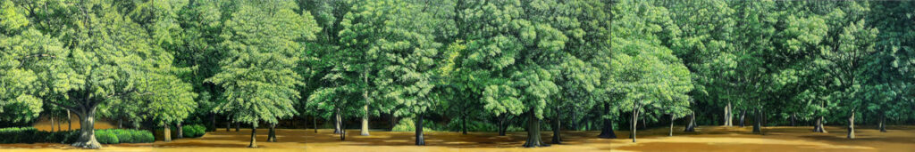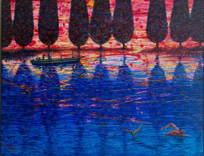 In the piece called The Mermaid are trees lined up that glisten in dense blacks against a blistering and illuminated red sky surrounding the sea. There’s a boat with six figures in it close to the shore and in the forefront of the art is a mermaid swimming. One wonders if the mermaid is swimming away from the boat as the water and sky are ablaze with intense blues, oranges and gold. This too, looks like paradise with its detailed brush strokes and reflections from the trees in the water. The beauty of nature and humanity is beguiling. One feels passion and the energy and forcefulness of the artist’s emotions. One feels both calm and a desire to be inside the painting, The mermaid being half animal and half human has found harmony in the natural world where Homo sapiens have not.