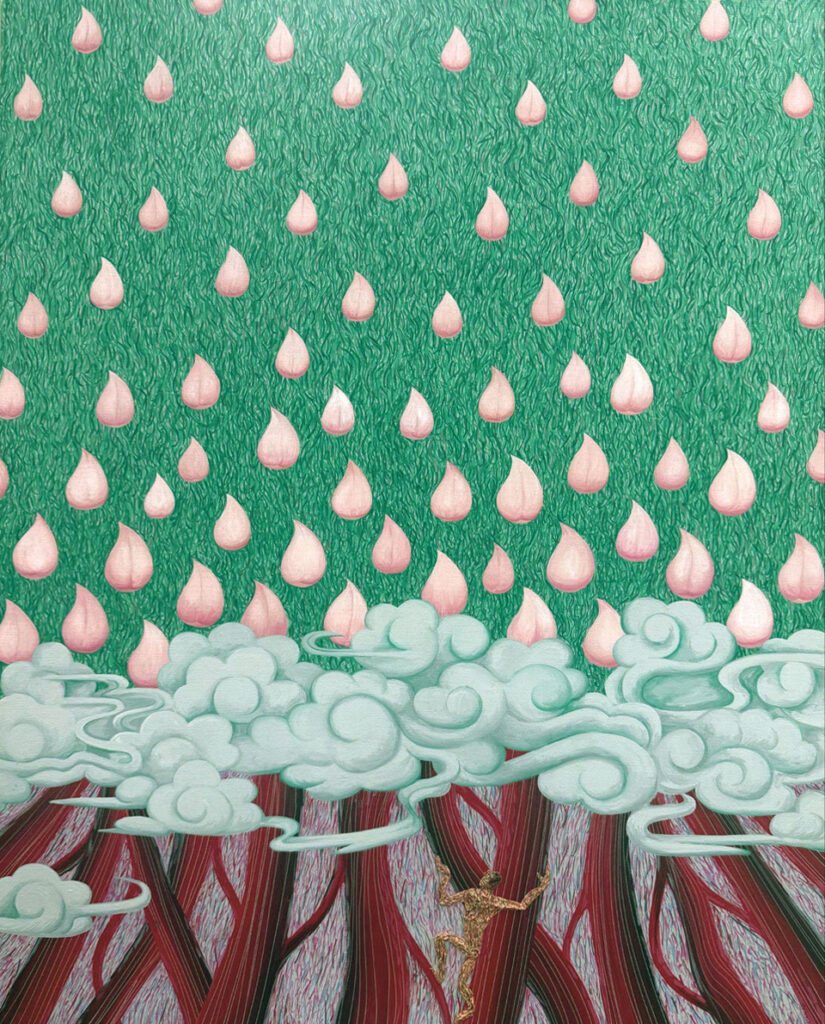 Kim’s paintings harken of Eden and have a religious undertone. In the piece titled Tears, there is a cascade of flesh colored tears hovering over swirling clouds. Beneath the clouds are maroon roots the size of tree trunks. The piece is divided into three portions. Entwined at the bottom where the roots are is a human figure. This figure looks like it’s climbing up into the clouds and seeking solace beyond the pull of what lies beneath in the earthly world. The human figures in Kim’s work are small, and delineated, like copper colored nerve endings tangled in tight circles. All suggesting that humans are the purveyors of chaos in the natural world, while the natural world follows its own path.