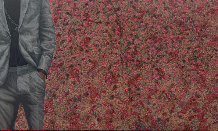 In Wildflowers, one sees total contrast. A man wearing a gray suit, head hidden. He is anonymous as he stands at the edge of the canvas against what appears to be pink wildflowers filling the remainder of the painting. When looking closely, human shapes are enmeshed within the wildflowers. This visual metaphor shows us that we are wildflowers, connected to nature, wild and beautiful. The puzzle here is the man by the side, whose face is unseen. His figure is imposing. Does he represent the unthinking human ravaging the earth? More questions to ponder. G&S